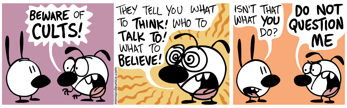 Critical towards other churches. Self-righteousness characterises the cult member, who rejects all questioning but feels free to judge the beliefs of others.