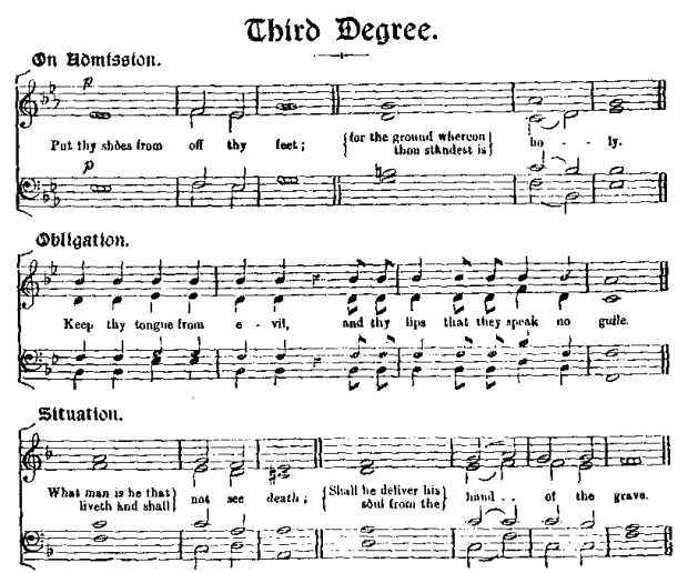 As the degrees advance, the penalties invoked by participants increase, eg, for the first degree. One's tongue is torn from its roots; for the second one's heart; or the third one's bowels. Participants pray that it may be so.